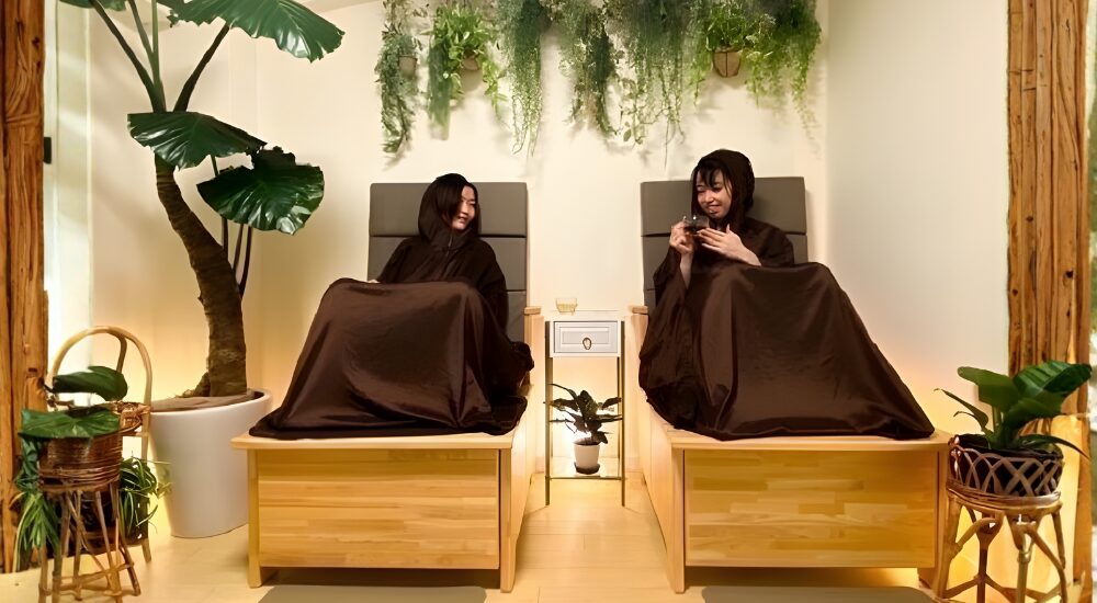 よもぎ蒸しと岩盤浴で大量の汗をかき、滞っていた古い血を排出します。