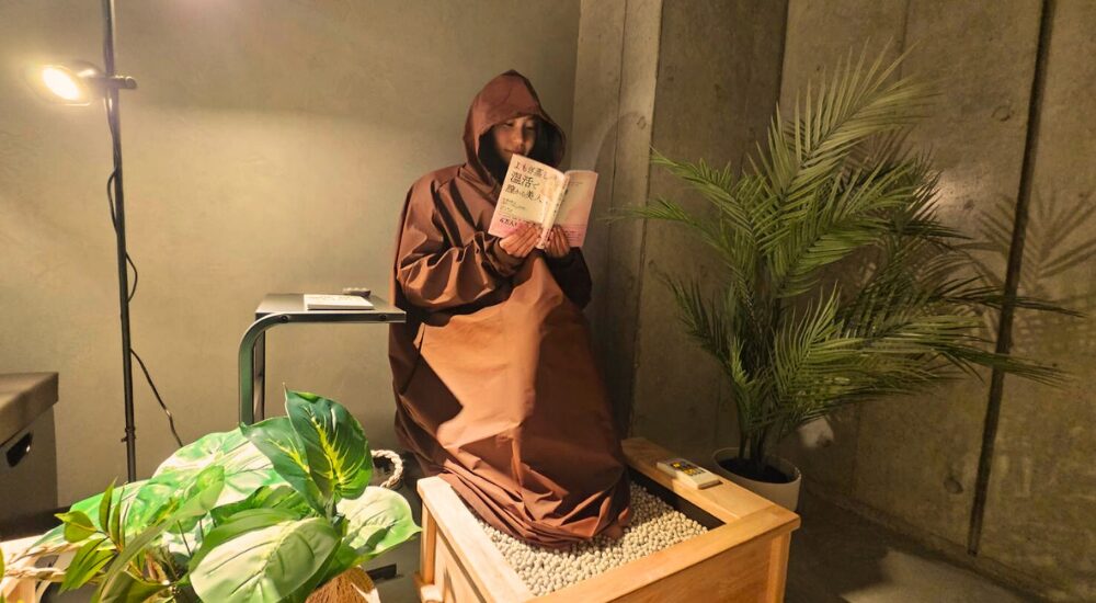 マントを被り、よもぎ蒸気を全身へ。足元はセラミック足湯でポカポカに。お湯ではないので、本を読んだりリラックスした体勢で大量の汗をかけます。